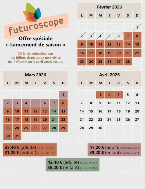 Cette offre promotionnelle s’applique aussi aux billets multi-jours, valables 2 ou 3 jours consécutifs de visite. La réduction de 20 % est également accordée sur les billets pour le parc aquatique Aquascope, ainsi que sur les billets combinés Futuroscope + Aquascope.