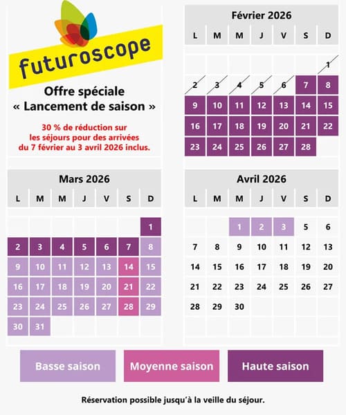Cette promotion s’applique à toutes les formules, du séjour 1 jour/1 nuit au séjour 3 jours/2 nuits, pour des dates d’arrivée entre le 7 février et le 3 avril 2026, vacances scolaires d’hiver incluses. Le parc étant ouvert tous les jours durant cette période, vous pouvez organiser votre séjour en toute liberté.