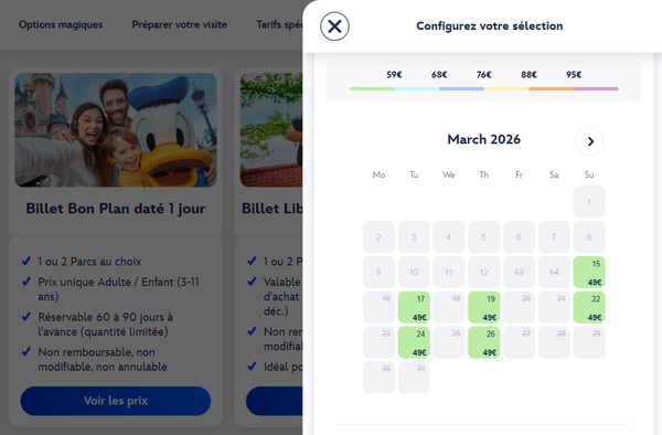 Consultez régulièrement le calendrier des prix de Disneyland Paris, mis à jour en temps réel. Pensez également à vérifier si le Billet Bon Plan est proposé pour vos dates.