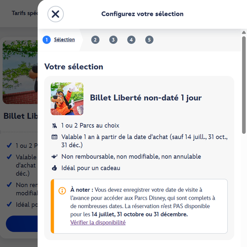 Attention, ce billet n’est pas utilisable les jours de très forte affluence, à savoir le 14 juillet, le 31 octobre et le 31 décembre. Contrairement au billet daté (remboursable sous conditions), le Billet Liberté est non modifiable, non annulable et non remboursable.