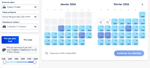 Nul besoin de chercher laborieusement le tarif le plus avantageux pour un séjour économique à Disneyland Paris ! Le parc propose un calendrier interactif qui fournit une estimation du coût total de votre visite. Cette estimation est basée sur votre date d’arrivée et se présente sous forme d’une fourchette de prix.