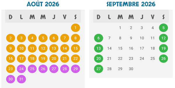 - 10 h à 18 h 30 : (couleur orange sur le calendrier)