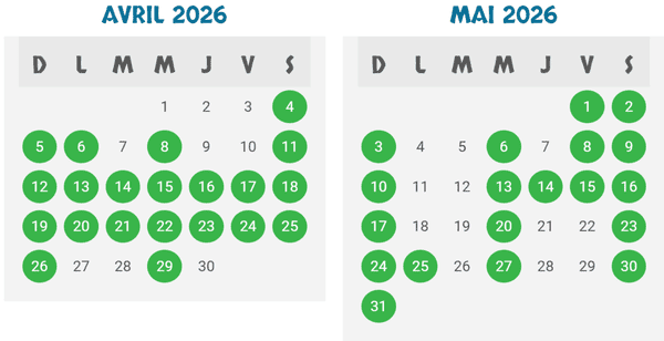 - 10 h 30 à 18 h : (couleur verte sur le calendrier)