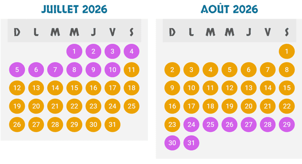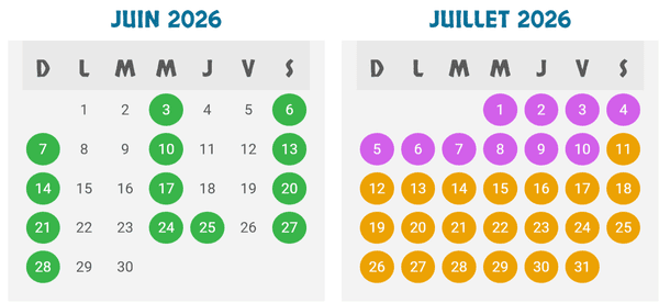 - 10 h à 18 h : (couleur violette sur le calendrier)