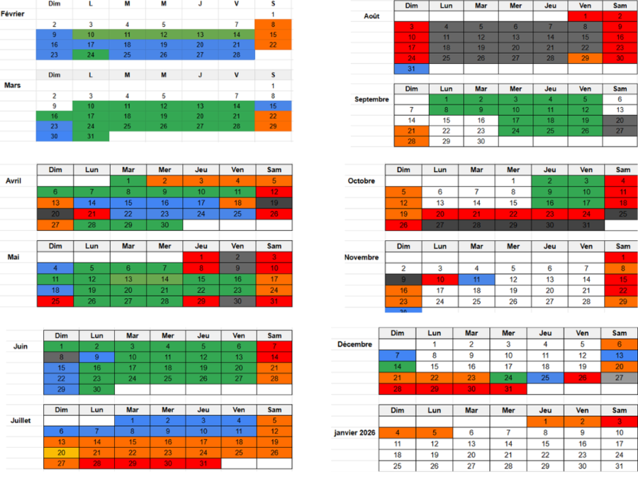 Le calendrier ci-dessous vous indique l’affluence attendue dans le parc pour la saison qui débute 8 février 2025 au 4 janvier 2026. Vous pouvez facilement identifier sur ce calendrier les jours calmes, les jours agréablement animés, les journées très fréquentés et les jours à éviter.