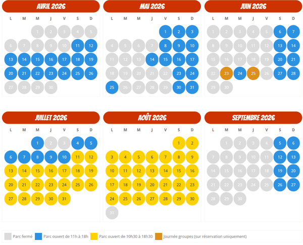 Kingoland vous accueille en 2026 du 11 avril au 27 septembre. Le parc est généralement ouvert de 11 h à 18 h en début et fin de saison, et de 10 h 30 à 18 h 30 pendant les vacances scolaires. Voici ci-dessous le calendrier d’ouverture de la saison.