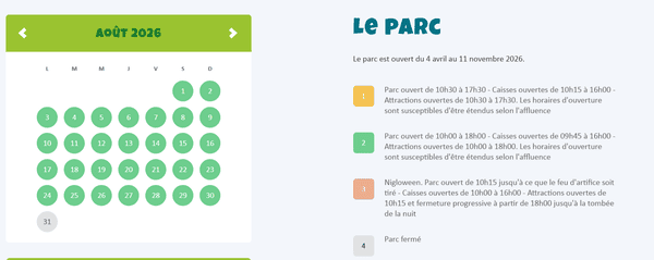 Ces horaires sont donnés à titre indicatif et peuvent varier. Nous vous conseillons de vérifier les calendriers afin de connaître les jours d’affluence au parc.