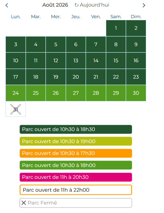 Les horaires varient selon les jours et saisons . Certaines dates sont programmées avec des fermetures à 17h30, 18h00, 18h30 ou 19h00, et lors d’événements spéciaux ou nocturnes (comme à la fin octobre) le parc peut rester ouvert jusqu’à 20h30 ou 22h00.