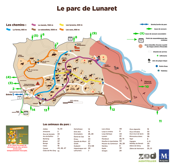 - En voiture : depuis l’autoroute A9 : prenez la sortie n°28 et suivez la direction « Hôpitaux – Facultés » puis « Zoo de Lunaret ». Nous vous conseillons d’utiliser Waze ou une autre application GPS pour vous orienter, car Google Maps peut indiquer un itinéraire erroné. Plusieurs parkings sont disponibles à proximité du parc : avenue du Val de Montferrand, avenue du Vert-Bois et avenue Agropolis.